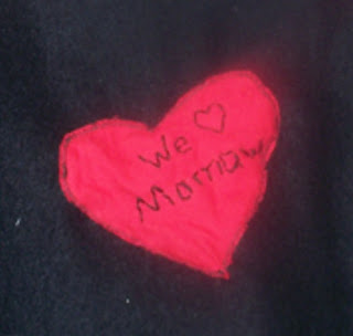 We made ALOT of our gifts this year, I would say about 1/2 of all our gifts were handmade, or at least some part of it was. The girls and I made these scarves for all the grandparents on my side of the family (my mom, dad, grandma, and mom's husband who the girls call papaw as well). I got the idea from Sara's Art House, the girls helped cut the fringe and then stitched the words on, I zigzagged them onto the scarves (although I am a little embarrassed to say I did, I took a picture of the worse of the 4). We put hearts on the grandmas, a mitten on one and a football shape on the other of the grandpa's.